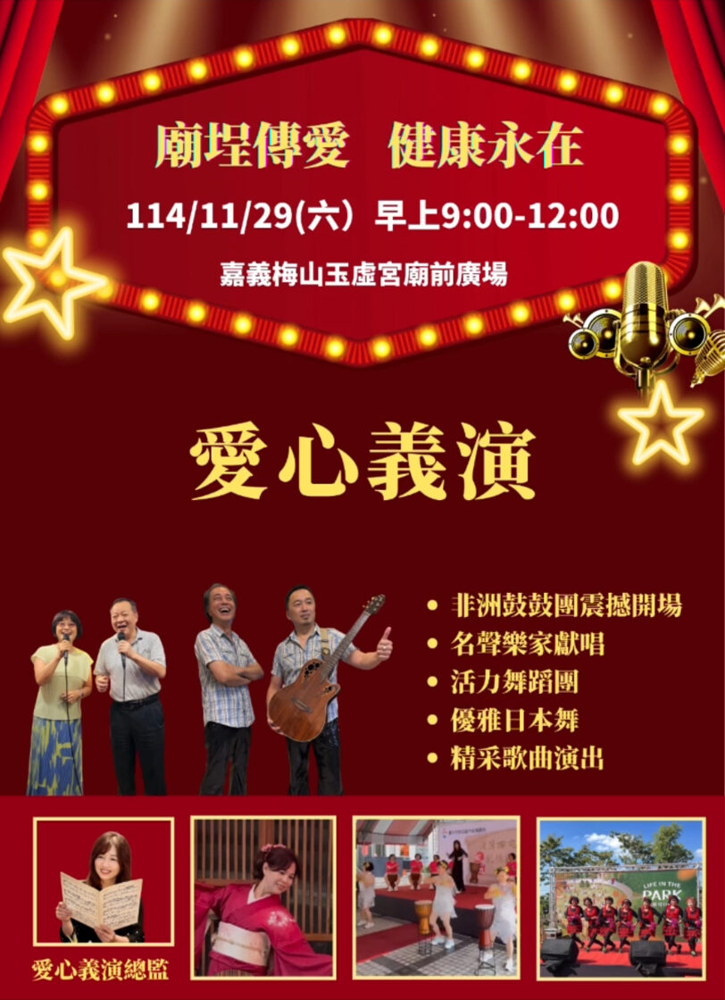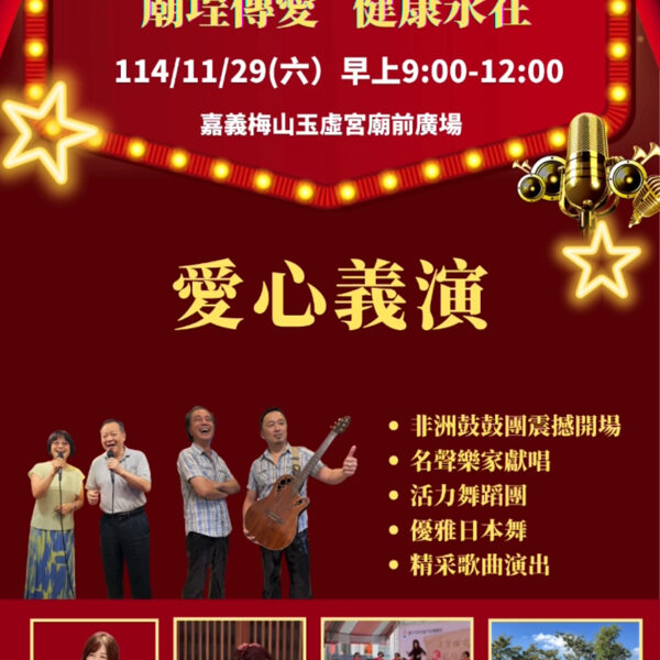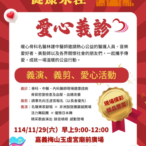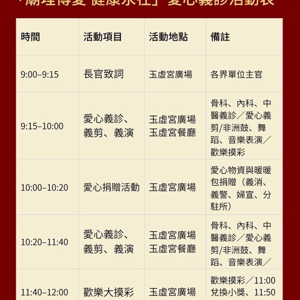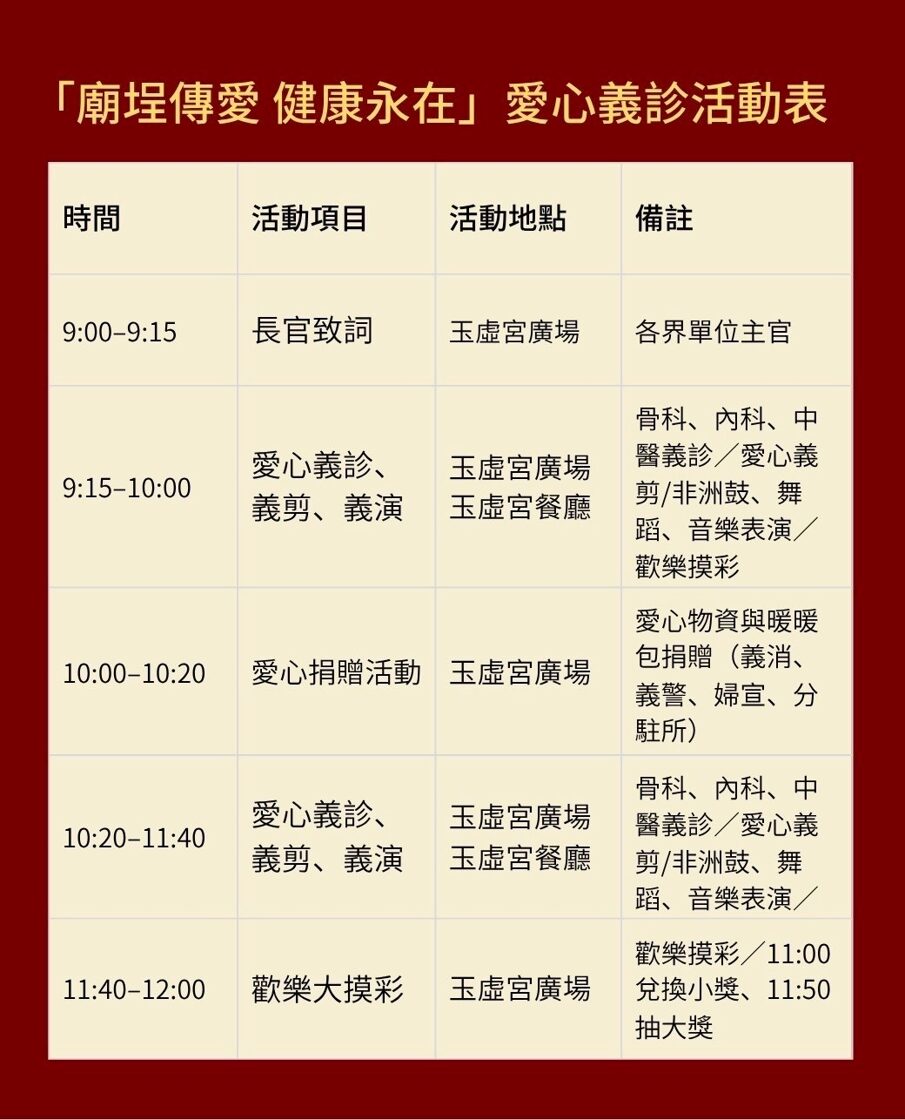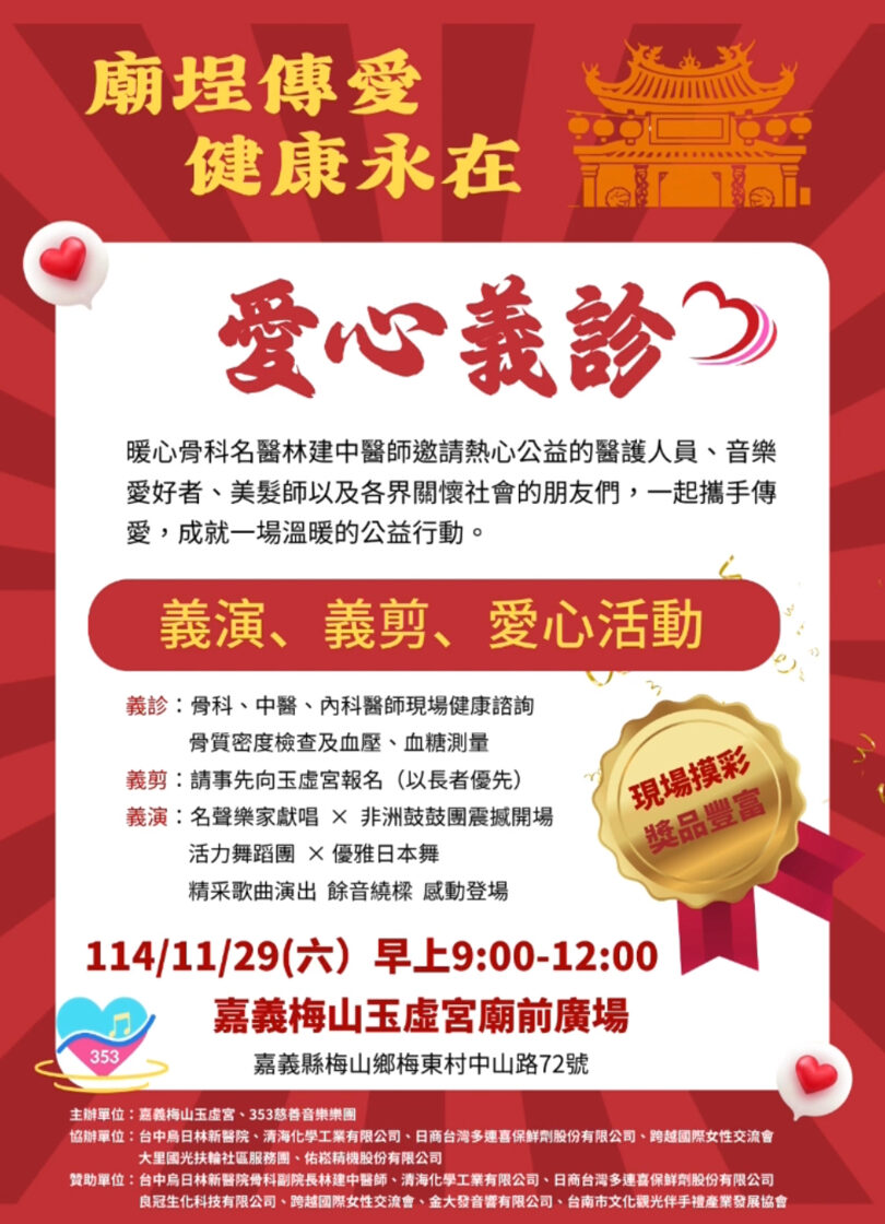 本年度國曆11月29日(星期六),上午9:00—12:00,地點:本宮廟埕舉辦【廟埕傳愛 健康永在】暨結合本宮冬令仁愛戶救助活動。