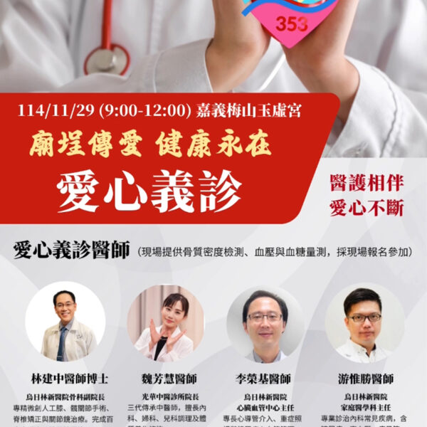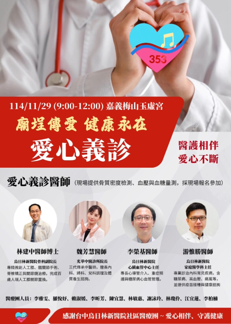 烏日林新醫院副院長林建中博士醫師率領本公益團員於:本年度國曆11月29日(星期六),上午9:00—12:00 地點:本宮廟埕